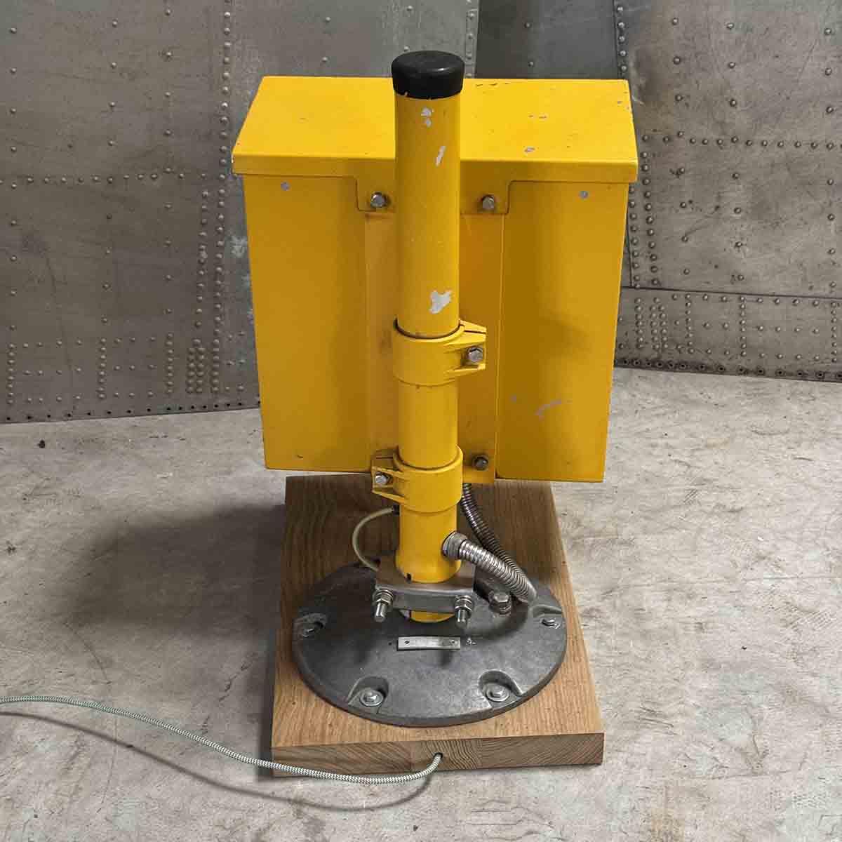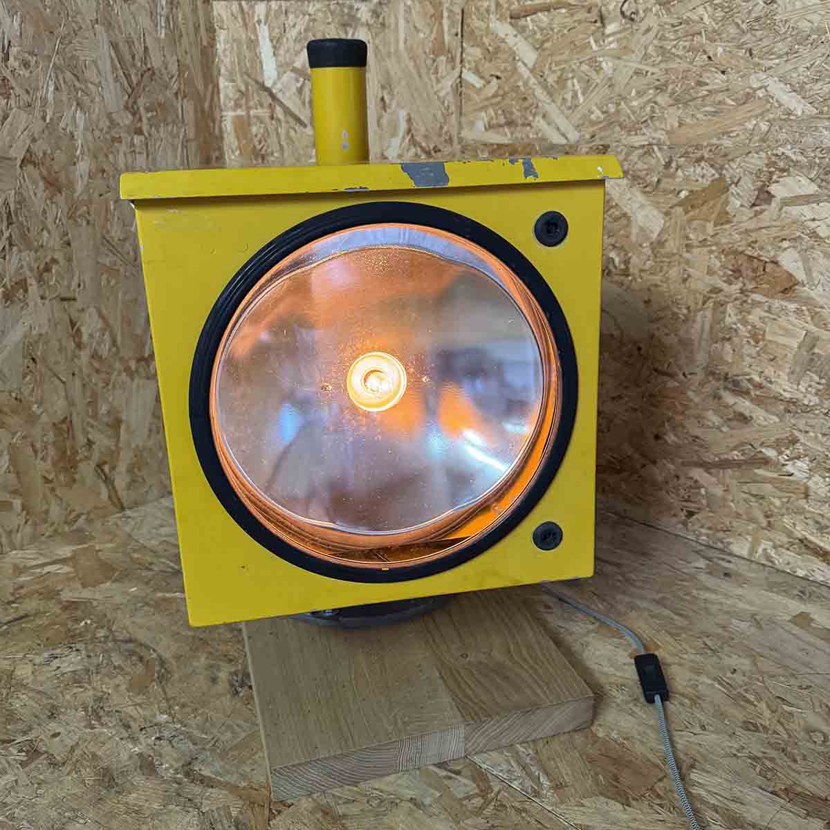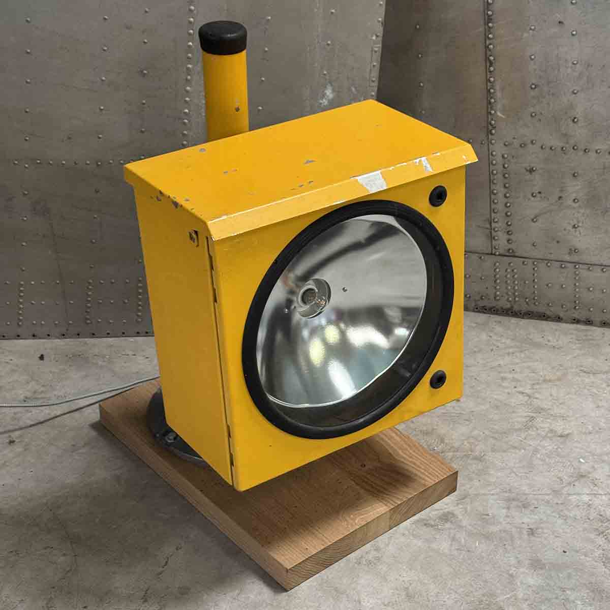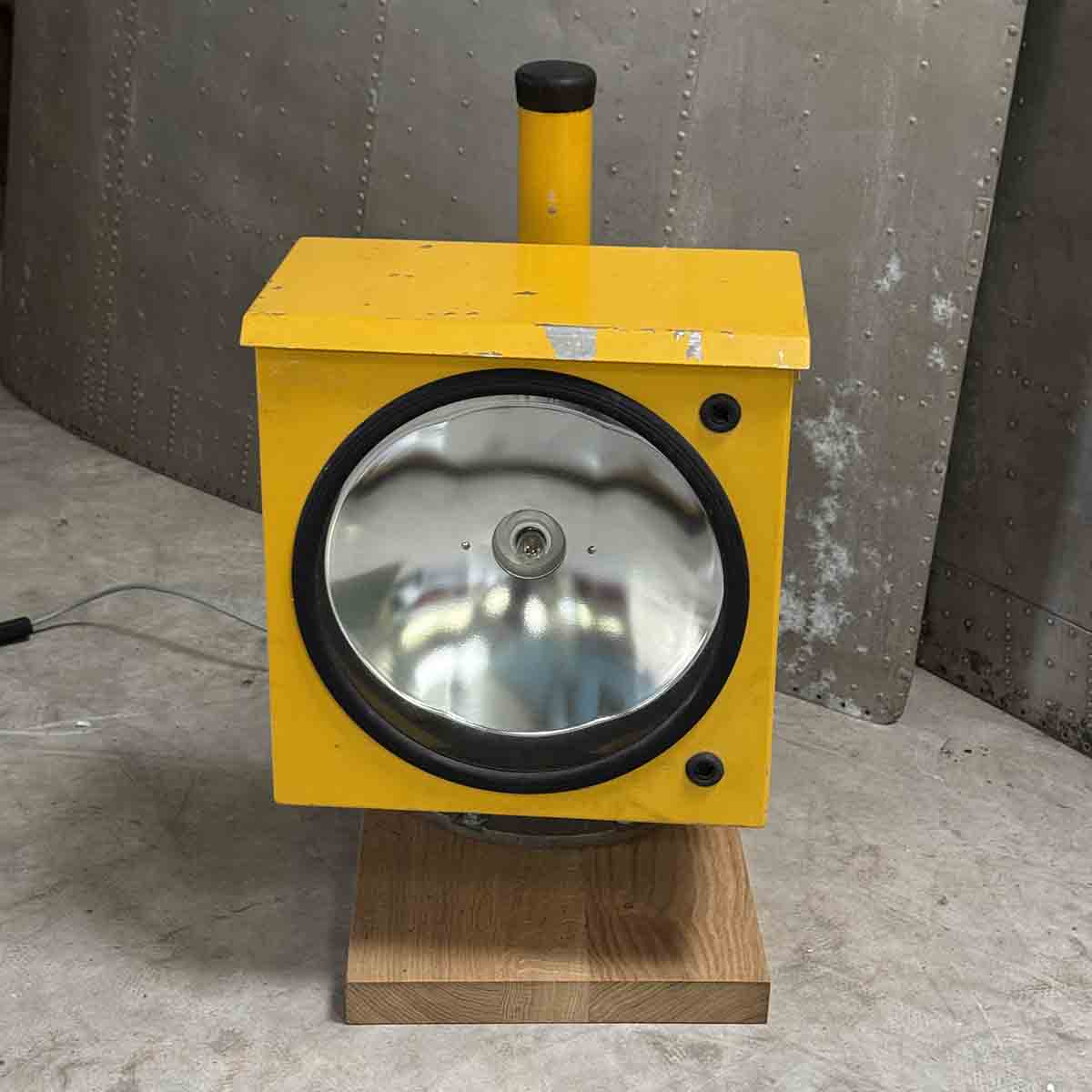 Original Honeywell ASL-40 approach sequence flash light, “running rabbit”. We have cleaned it, added an oak base, replaced the original light source with a 3W LED light and installed a power cord with a connector and a switch. We have retained the original layer of distinctive yellow paint.
