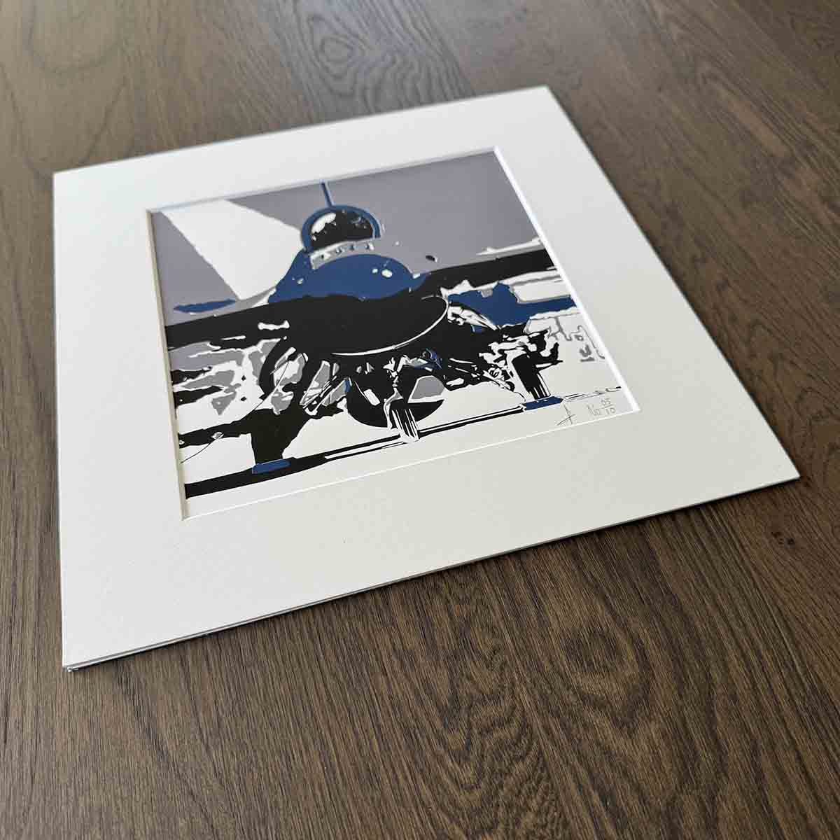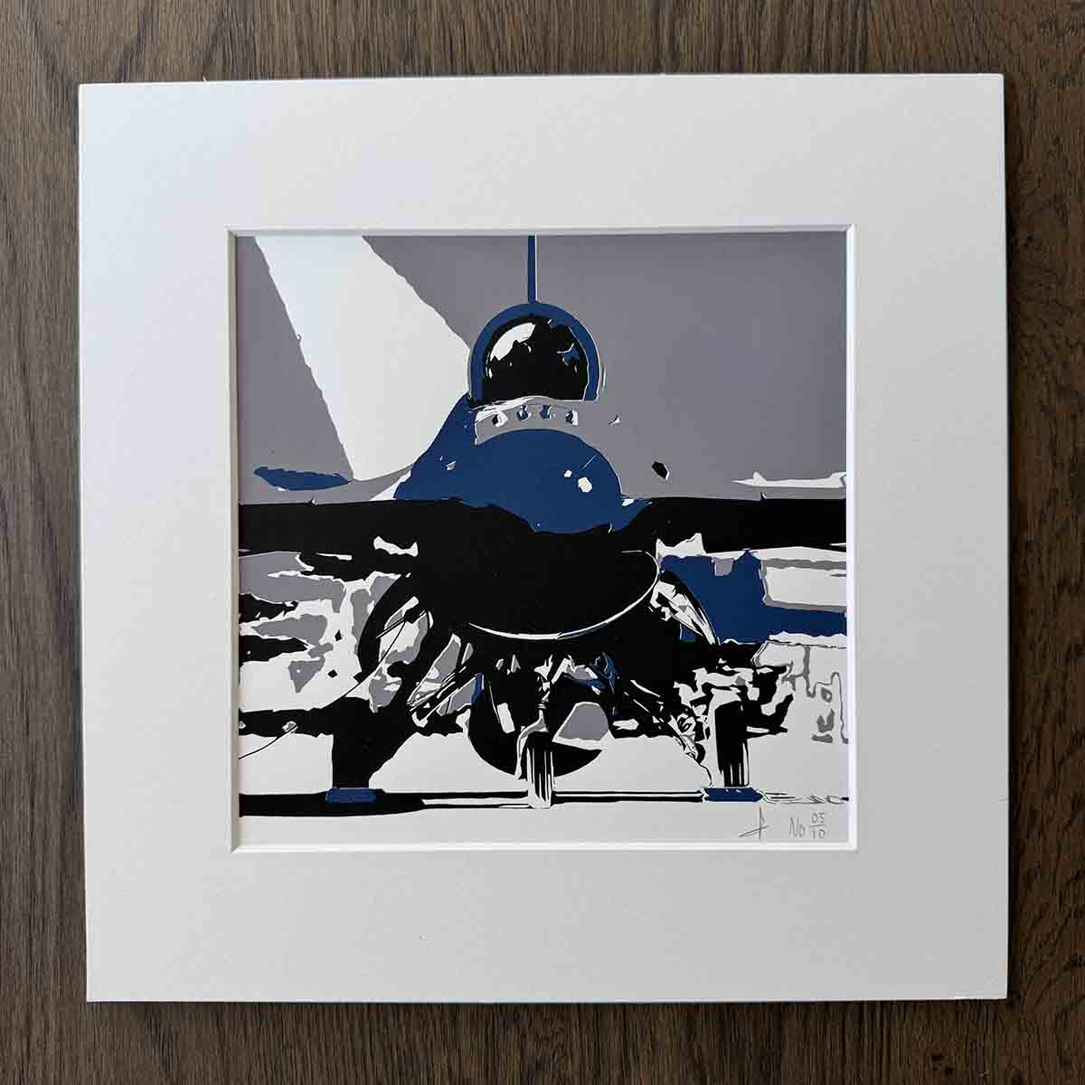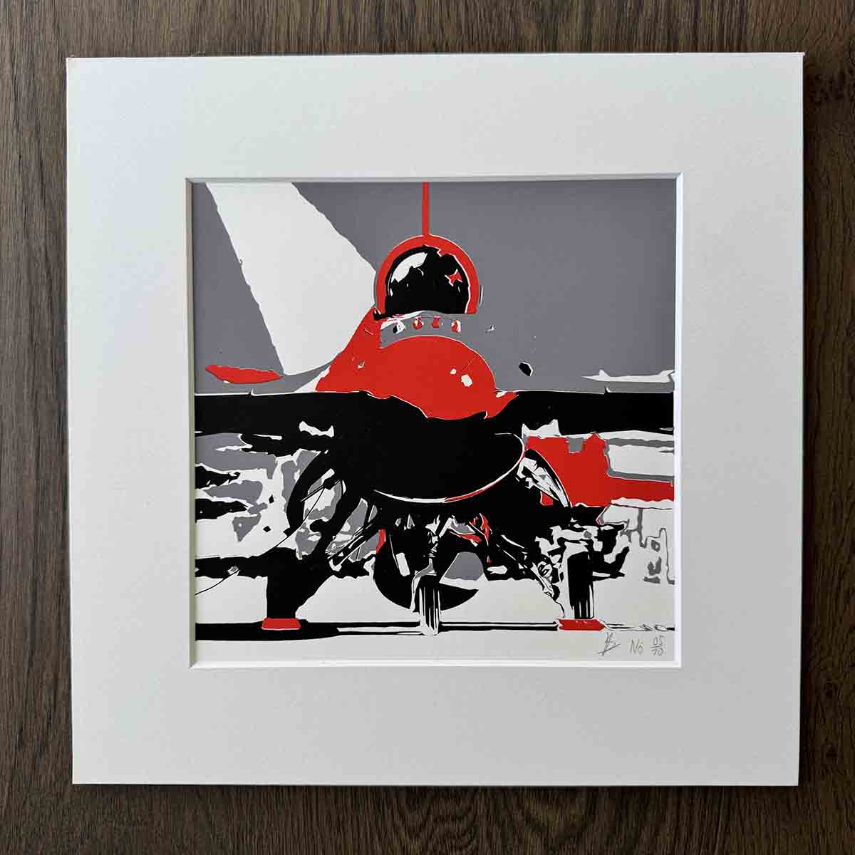 Handmade screen prints of a Lockheed-Martin F-16 Fighting Falcon. Comes with custom-made passe-partout. Colours; grey, black and either red or blue.
