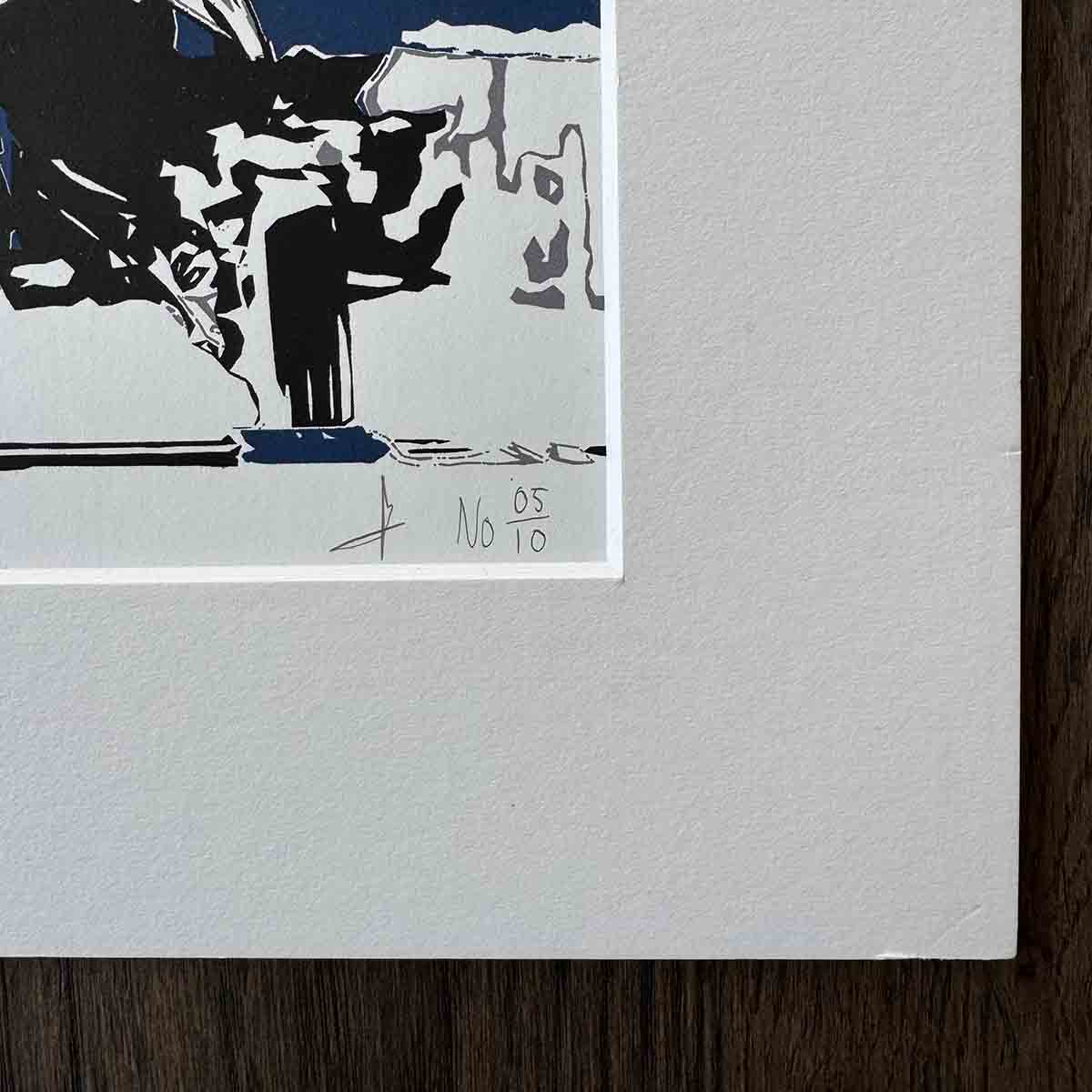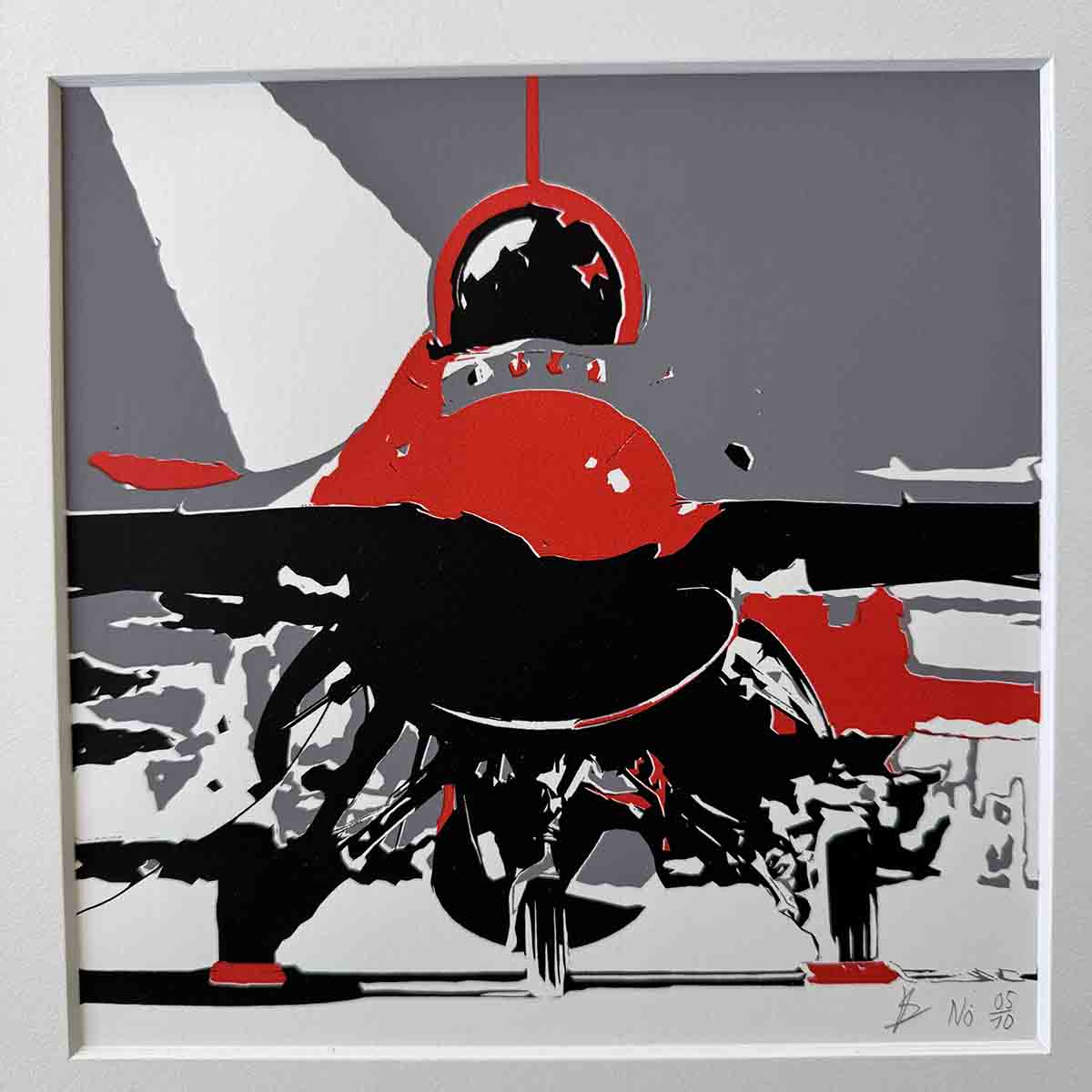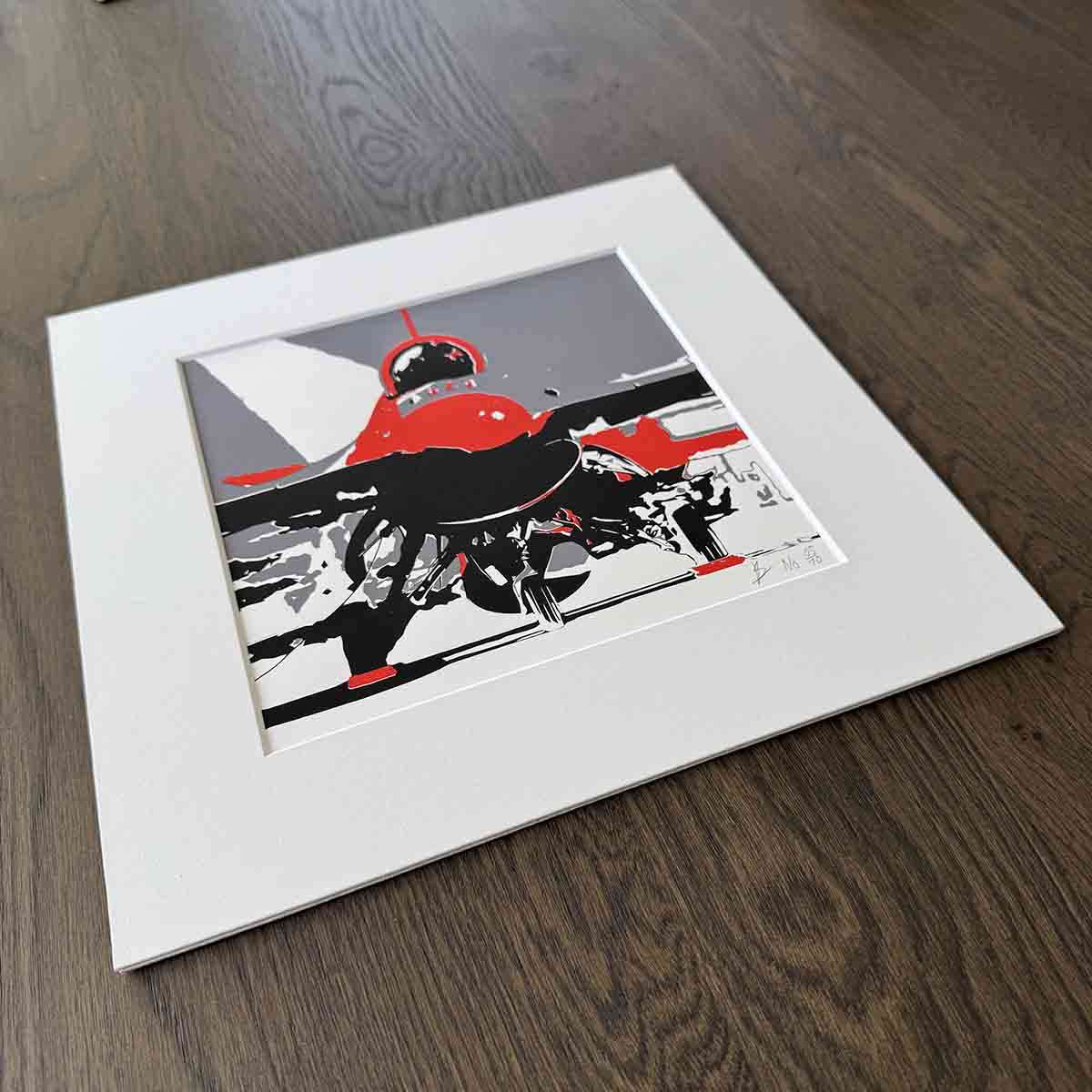 Handmade screen prints of a Lockheed-Martin F-16 Fighting Falcon. Comes with custom-made passe-partout. Colours; grey, black and either red or blue.