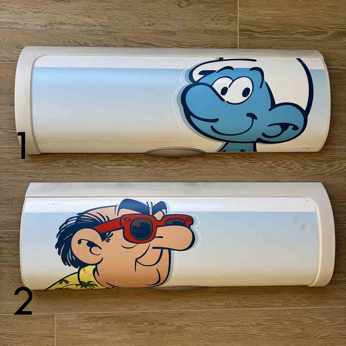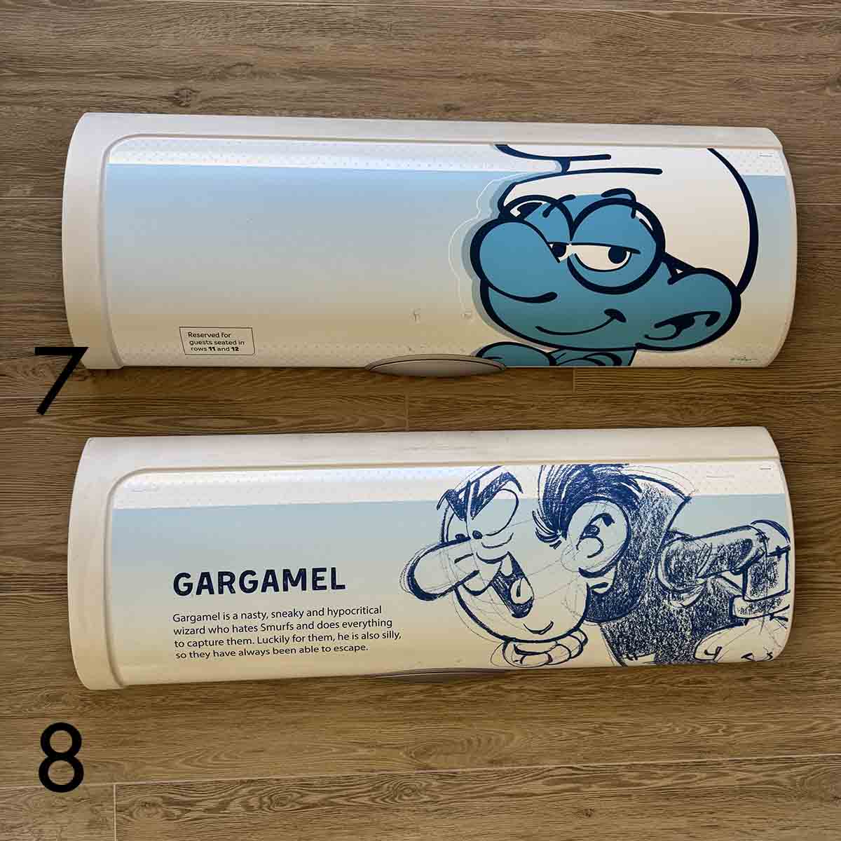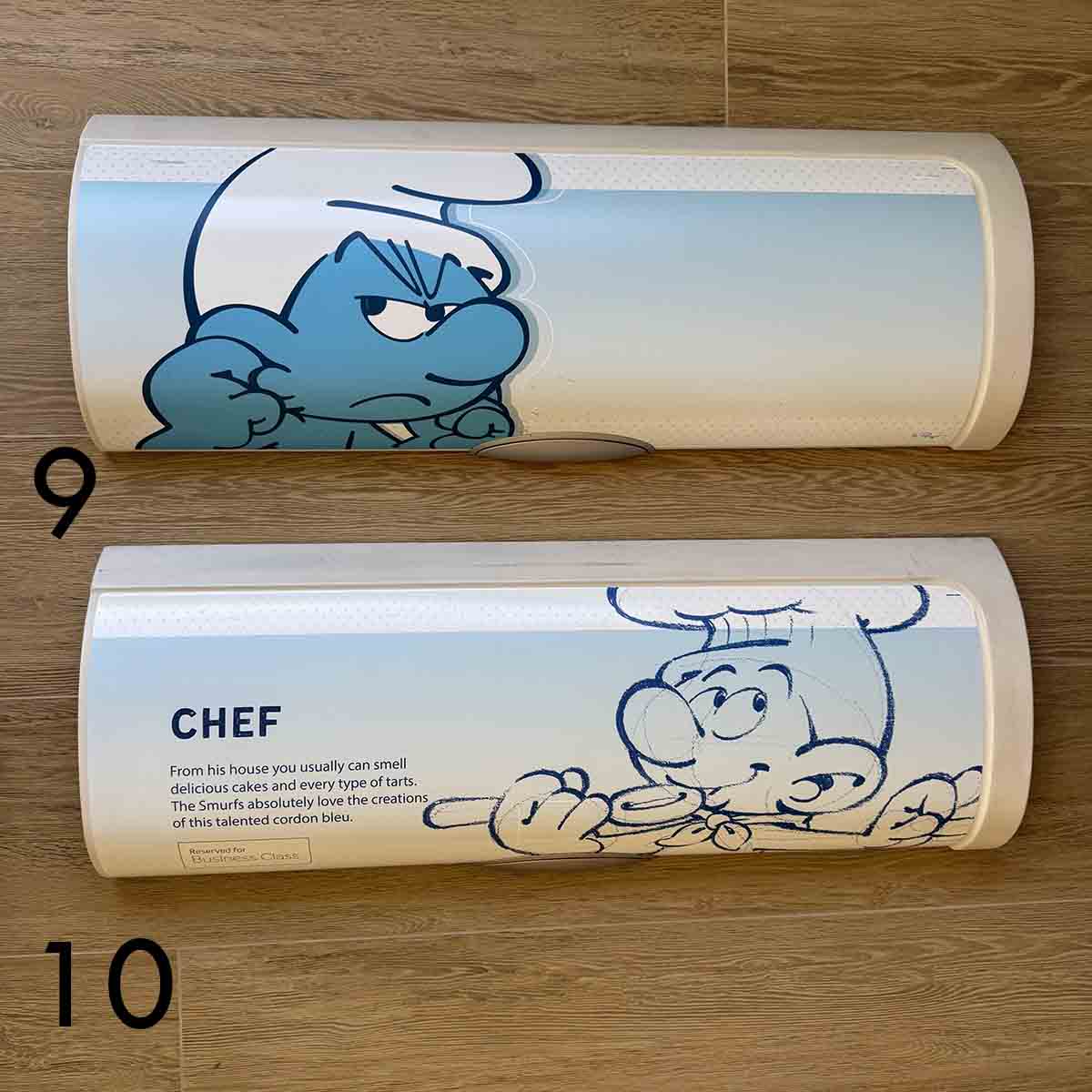 Original Brussels Airlines overhead luggage bin doors. These doors were used in Brussels Airlines Airbus A320 OO-SND “Aerosmurf”. The aircraft was painted in The Smurfs colour scheme. Each door has its own design and they all look very nice, despite some smaller damages (as a result of use in the aircraft).