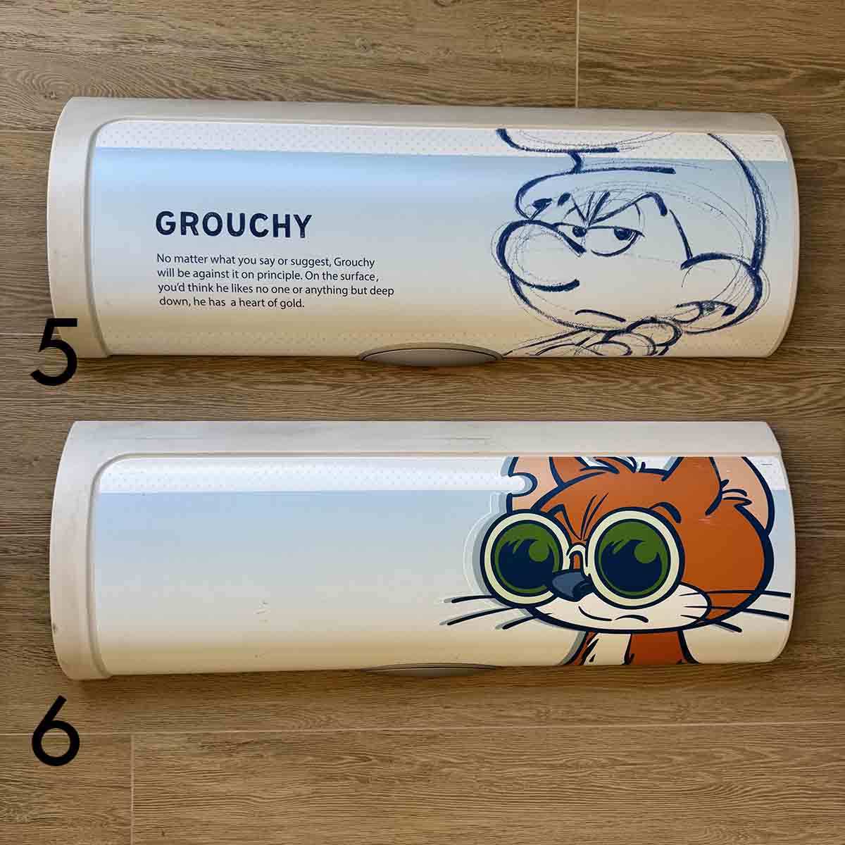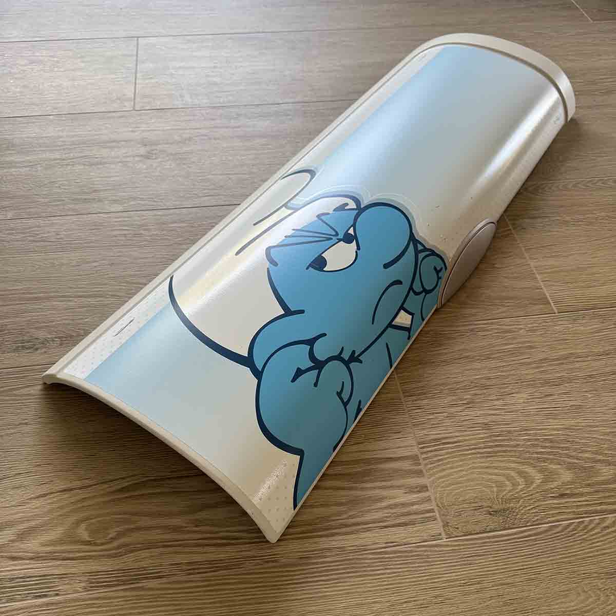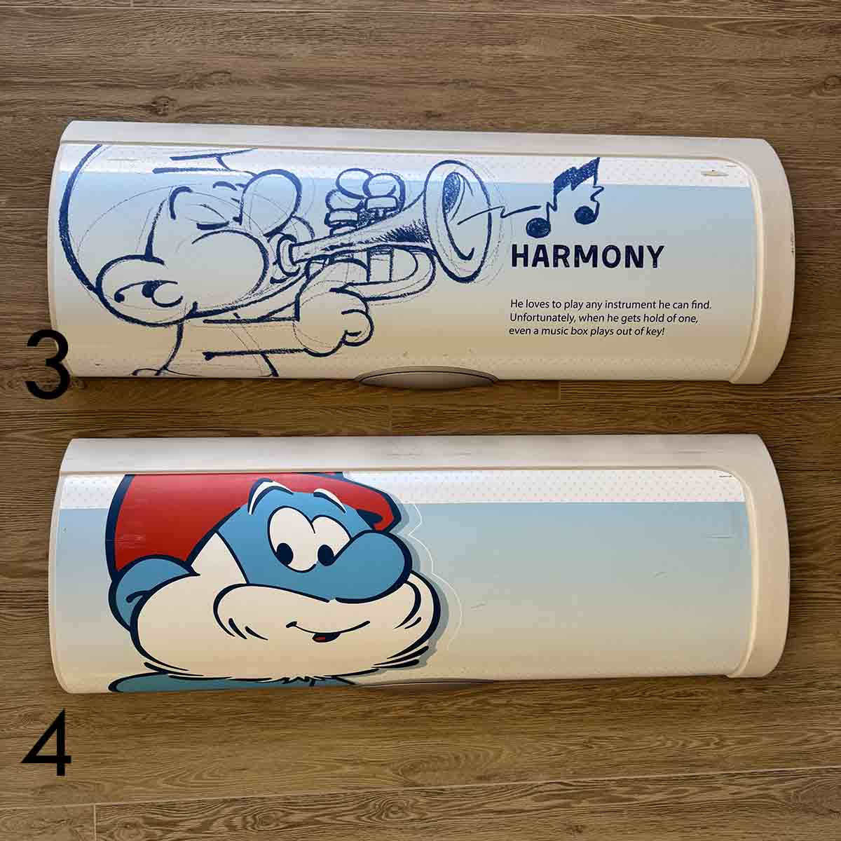 Original Brussels Airlines overhead luggage bin doors. These doors were used in Brussels Airlines Airbus A320 OO-SND “Aerosmurf”. The aircraft was painted in The Smurfs colour scheme. Each door has its own design and they all look very nice, despite some smaller damages (as a result of use in the aircraft).