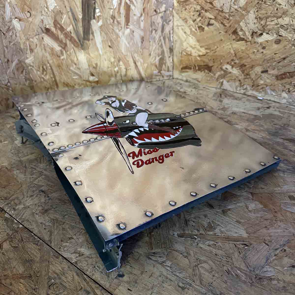 This self-standing piece was cut (rough) from the remains. This panel was polished. The Miss Danger nose art was painted on later and is purely decorative.