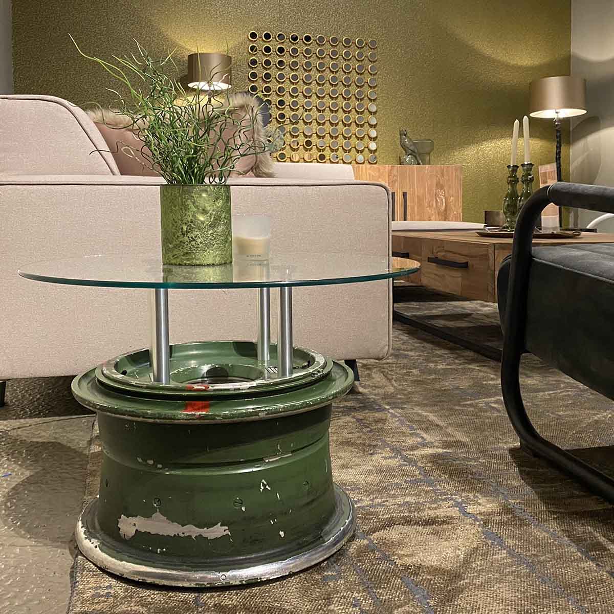 This is a unique side table, made from a wheel of the main landing gear of a Polish Air Force MiG-29 Fulcrum.