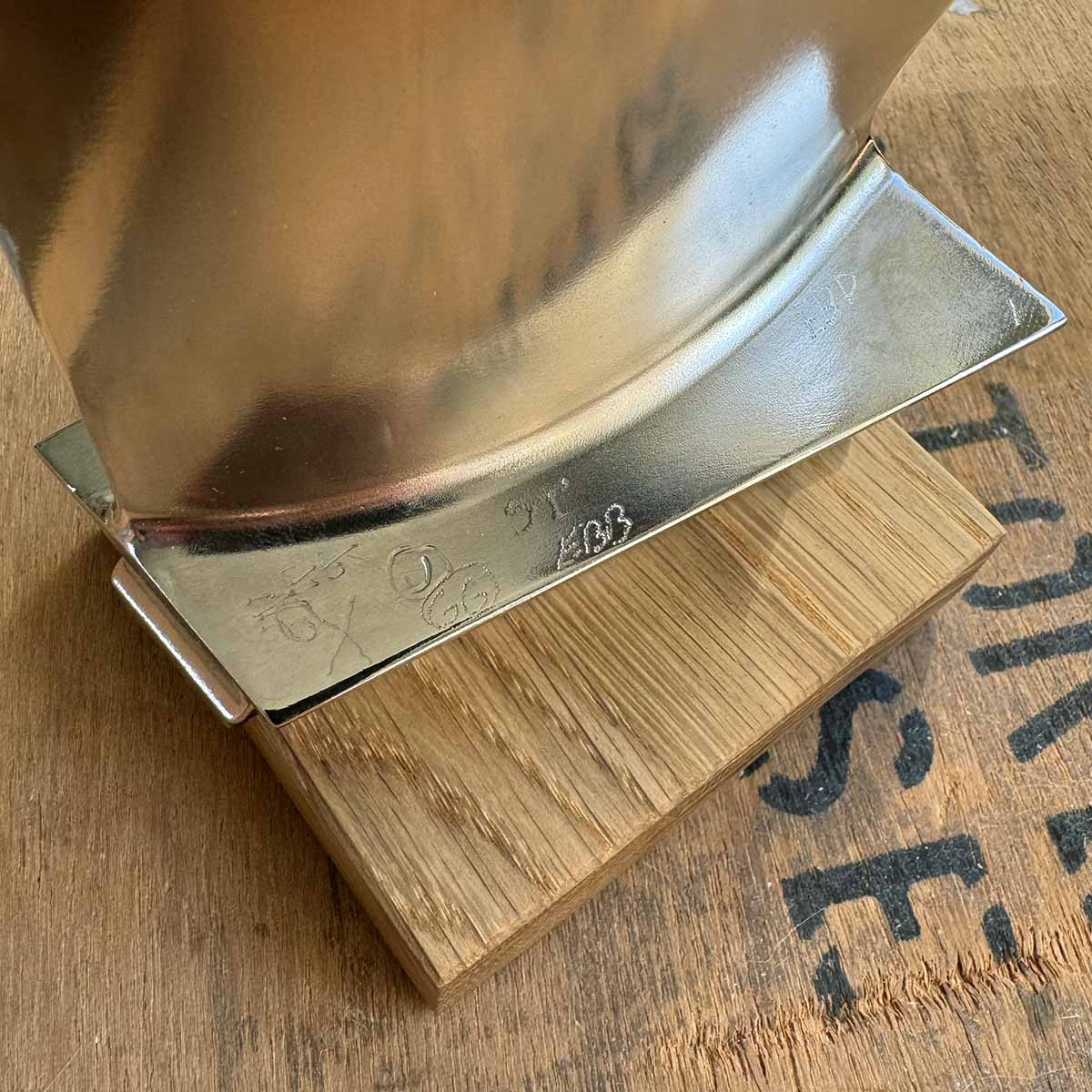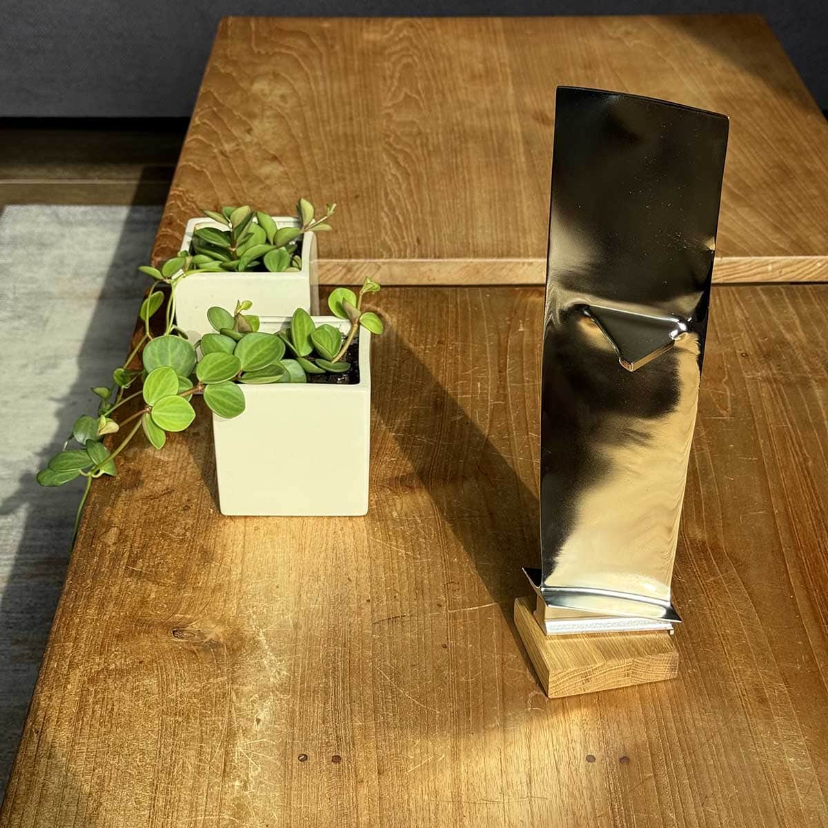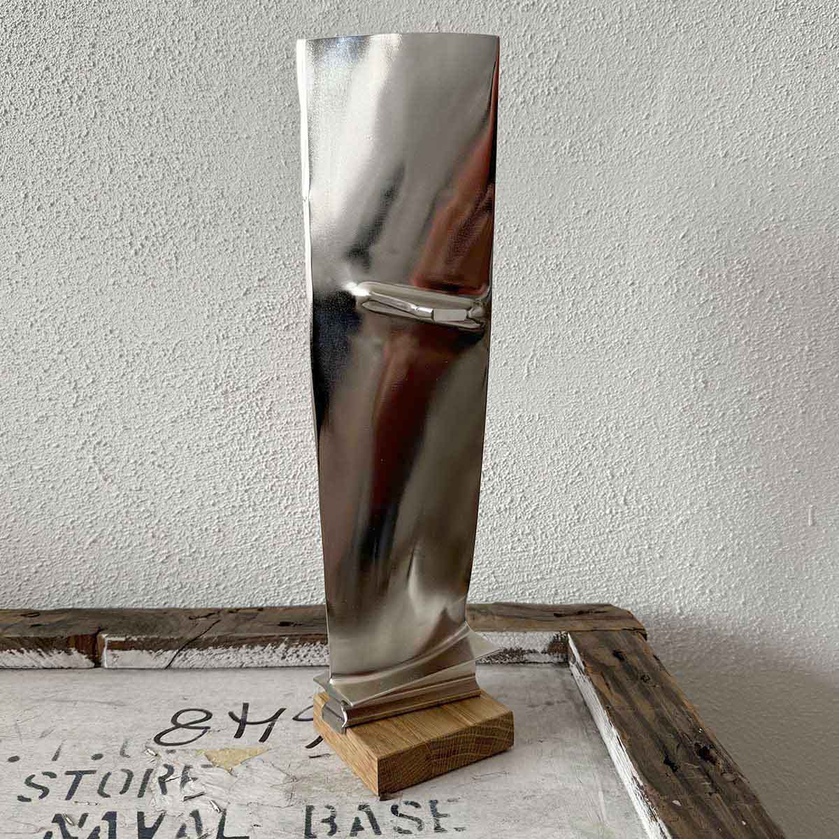 Original Pratt & Whitney JT8D engine fan blade. We have taken a disused fan blade of one of the many JT8D jet engines and decided it deserved a future as decorative piece. After cleaning it, we had it chrome plated and installed it on an oak base.