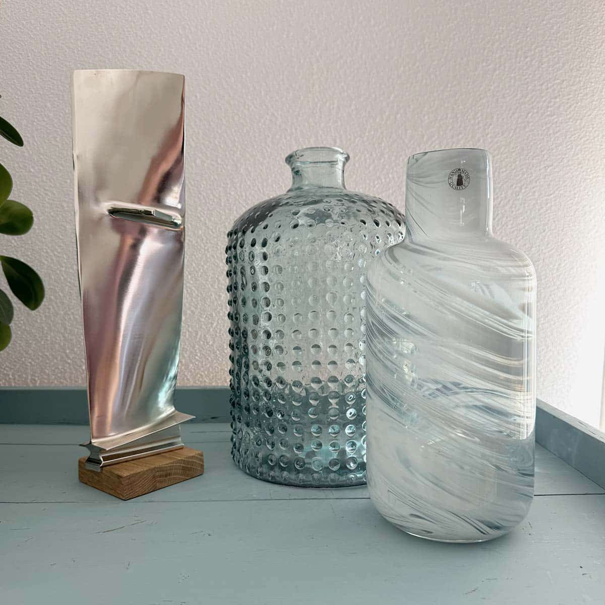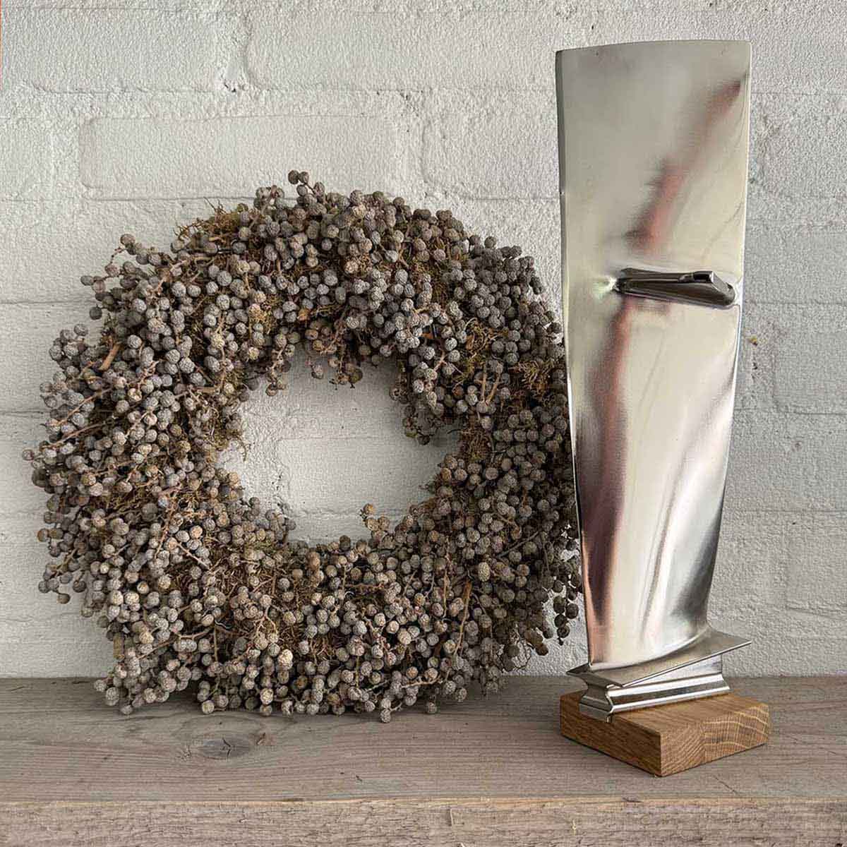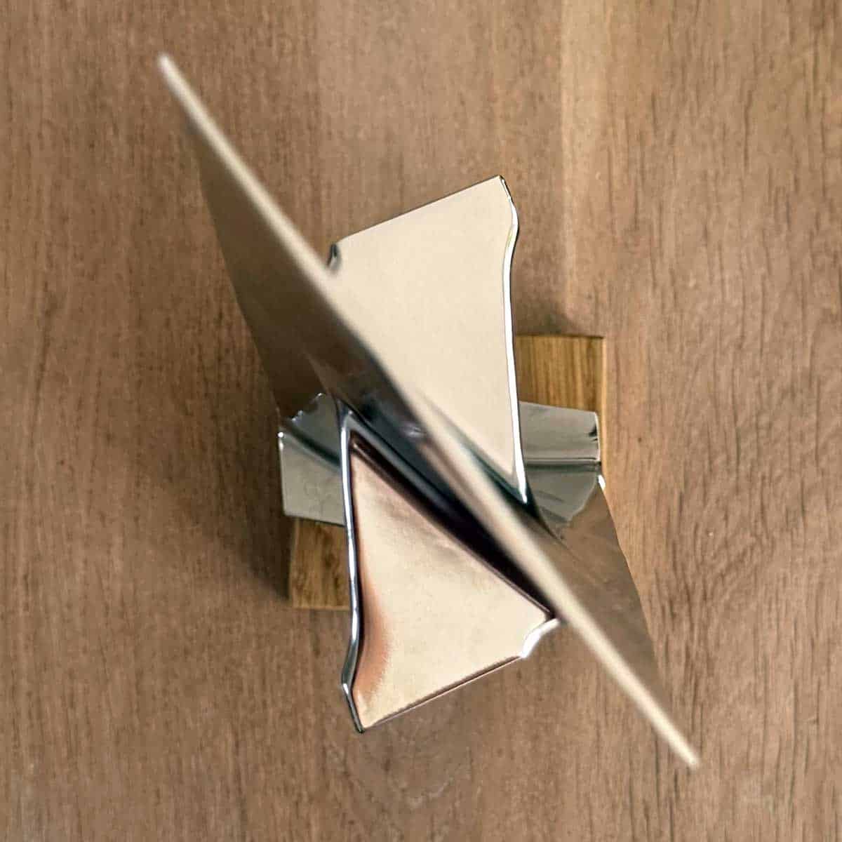 Original Pratt & Whitney JT8D engine fan blade. We have taken a disused fan blade of one of the many JT8D jet engines and decided it deserved a future as decorative piece. After cleaning it, we had it chrome plated and installed it on an oak base.