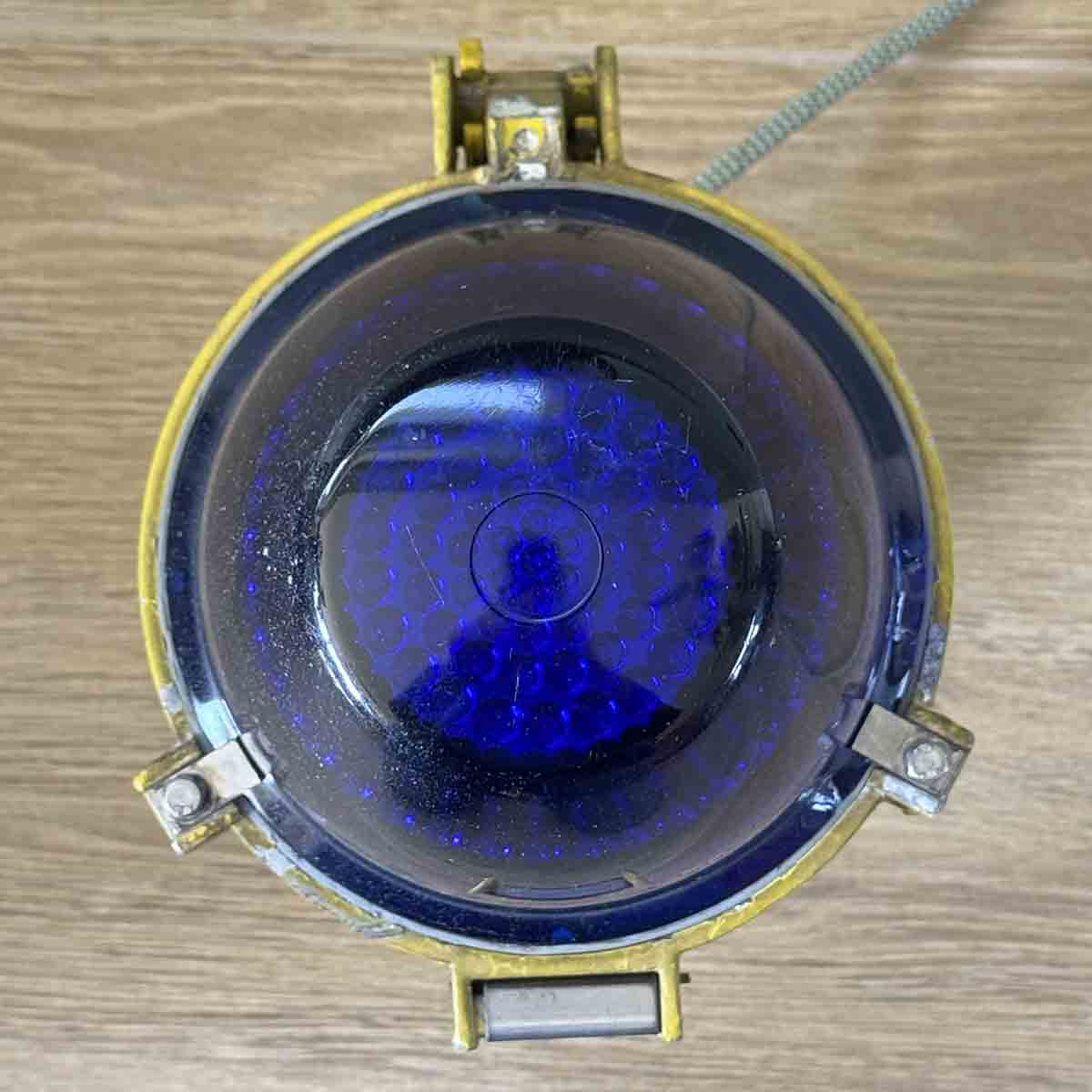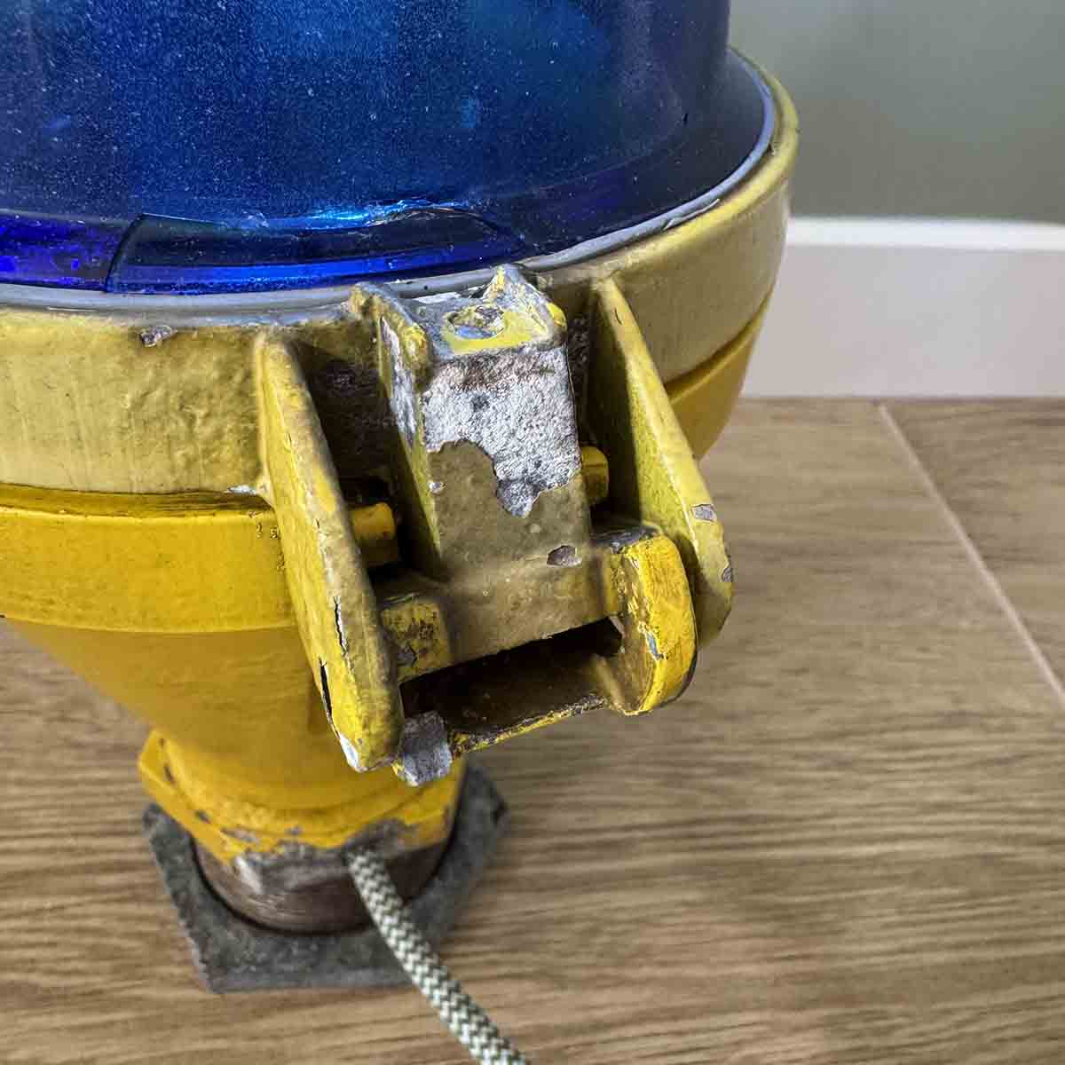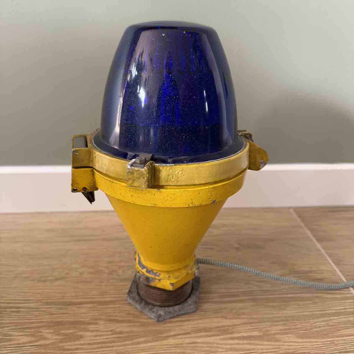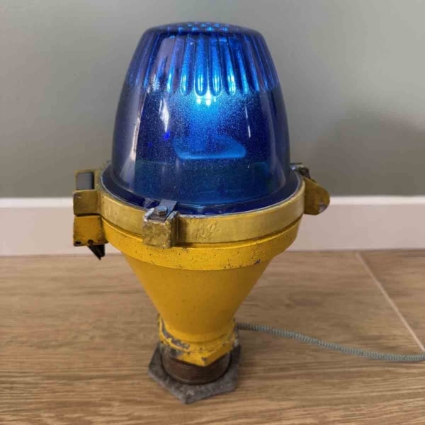 If you have ever flown in an aircraft, you might recall the characteristic blue lights next to the taxiway. You can now replicate this feeling yourself. We have taken a number of original Thorn taxiway lights and thoroughly cleaned them. We also replaced the original light source with a 3W LED light and installed a power cord with a connector and a switch. We have retained the original layer of distinctive yellow paint.
