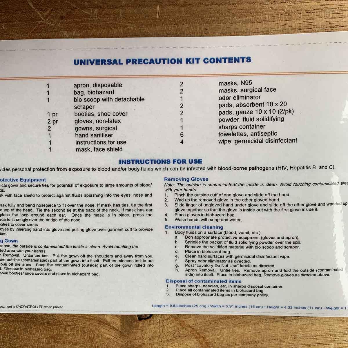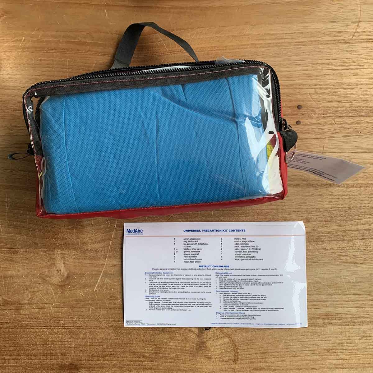 Original MedAire universal precaution kit. Kit includes masks, gloves, shoe covers, odor eliminator and many others items.
